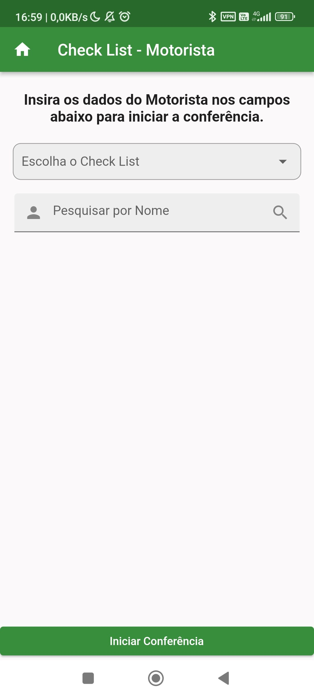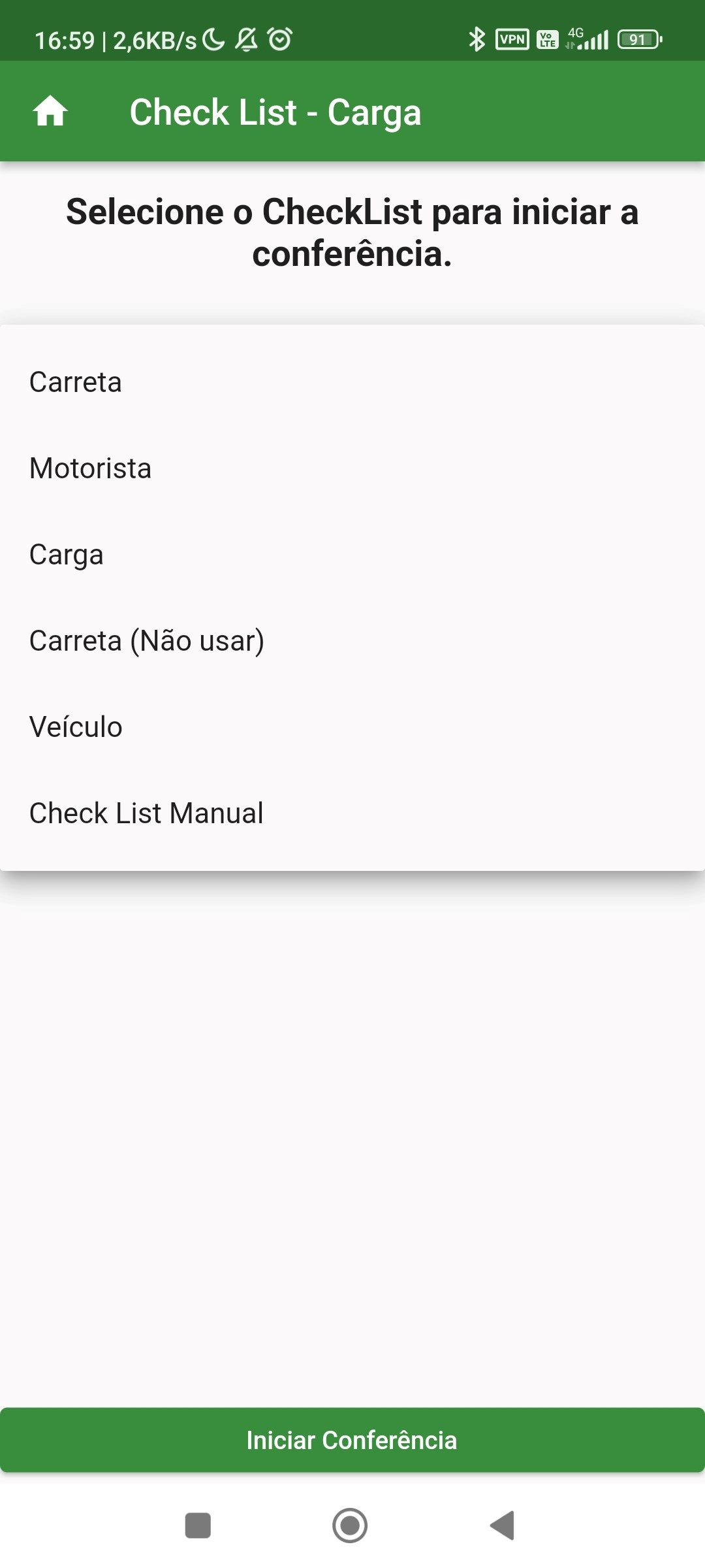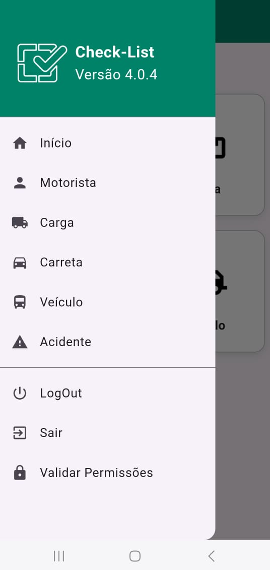 Após realizar o login o usuário será direcionado para a tela inicial e deve selecionar o check-list que irá realizar dentre as opções: Motorista, Carga, Carreta, Veículo e Acidente.