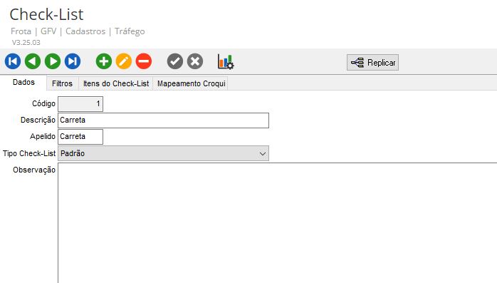 Os check-lists que serão apresentados no aplicativo são cadastrados no módulo GFV em Cadastros > Tráfego > Check-List - Guia “Dados”: