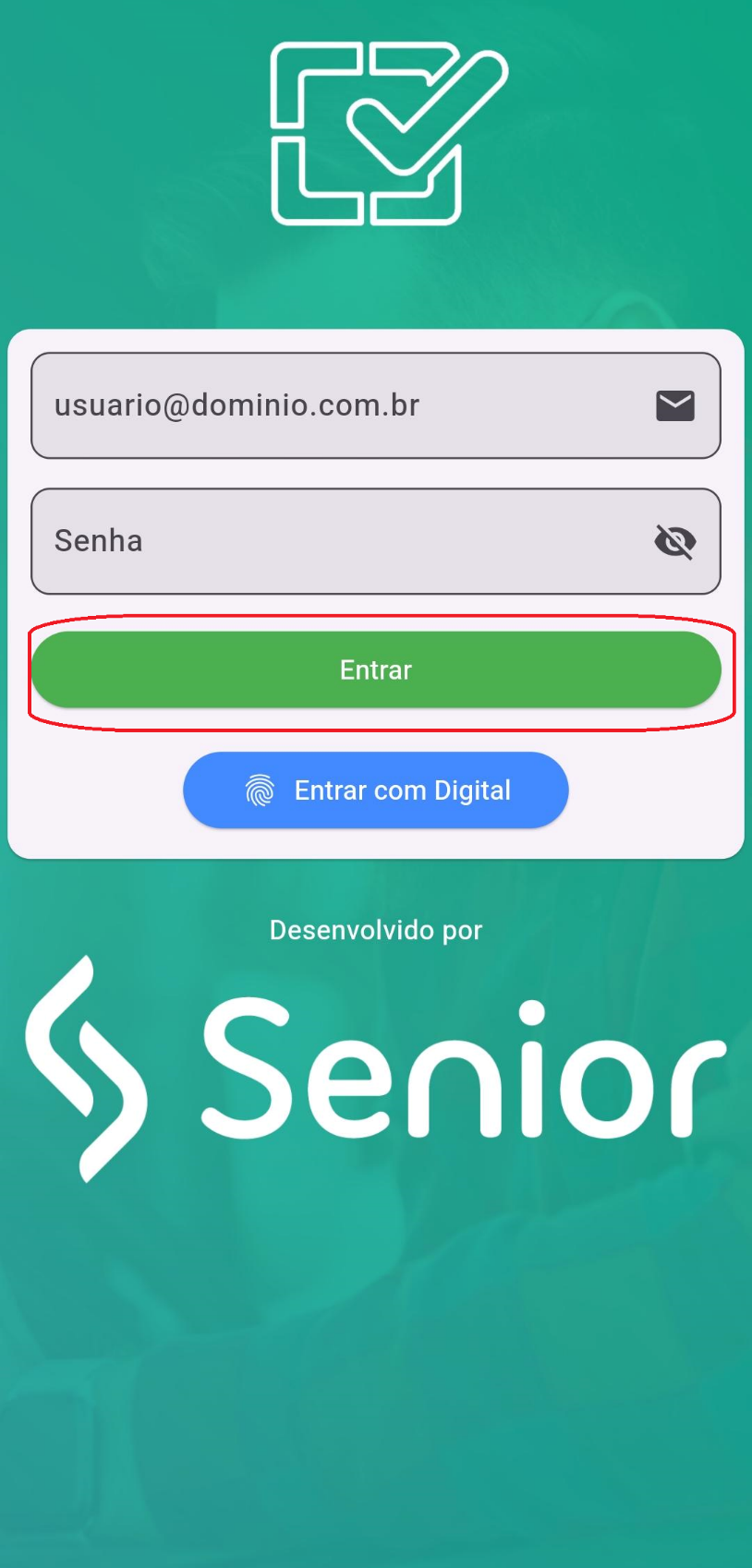 - Para o correto cadastro e uso da biometria, o usuário deve realizar o login normalmente com seu usuário e senha e pressionar o botão Entrar.