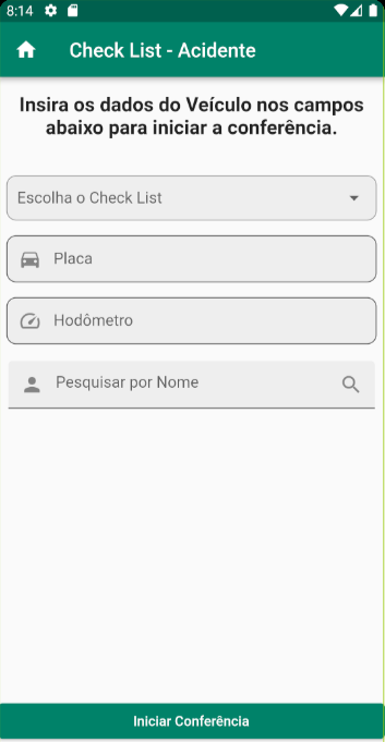 Ao selecionar o check-list de Acidente, o usuário será direcionado para a tela inicial: