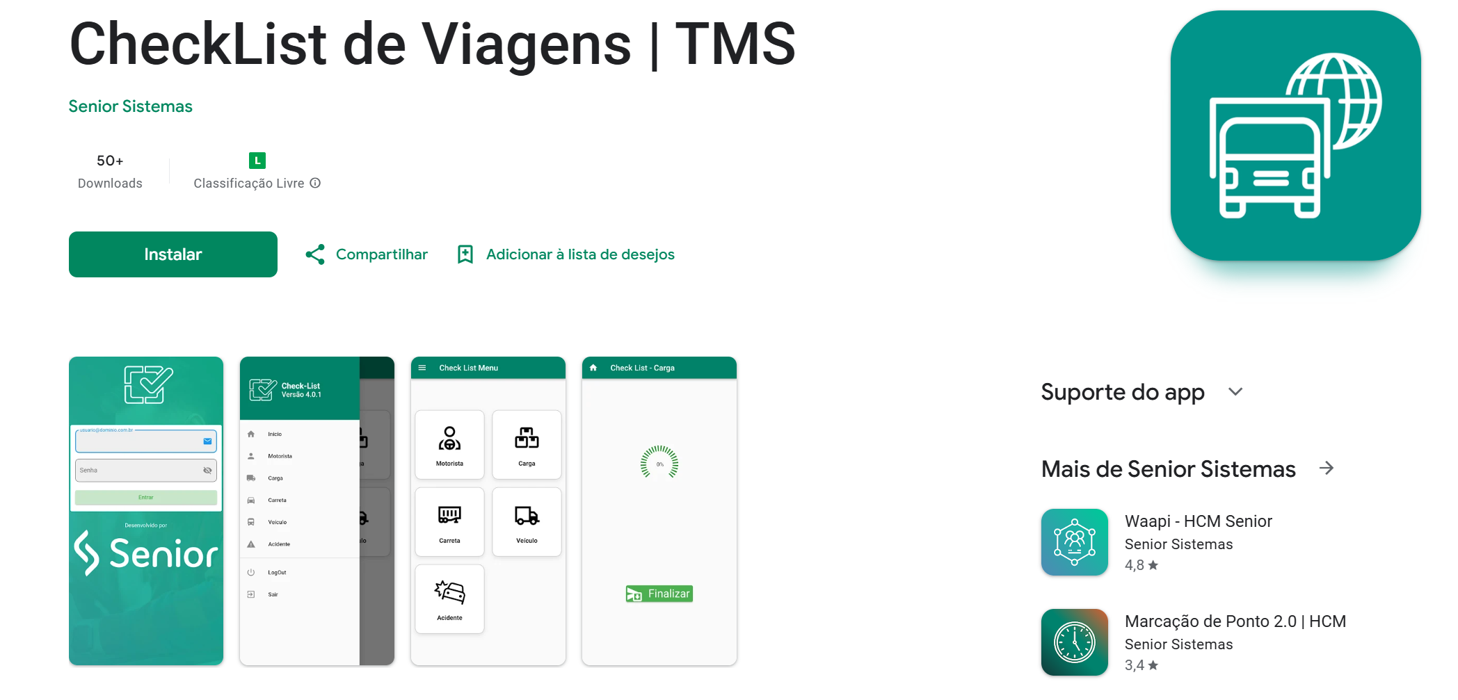 O aplicativo CheckList de Viagens | TMS está disponível para download na Google Play Store.