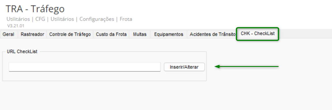 No módulo CFG, em Utilitários > Configurações > Frota > TRA - Tráfego, na guia CHK - CheckList, é exibido o campo URL CheckList. Neste campo, deverá ser preenchida a URL com a porta criada, seguindo o exemplo: http://999.999.999.99:8089.