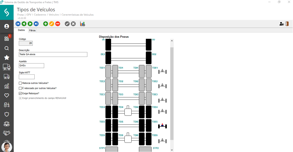 No módulo GFV, em Cadastros > Veículos > Características dos Veículos > Tipos de Veículos. O sistema permite cadastrar até seis eixos, de acordo com o tipo do veículo.