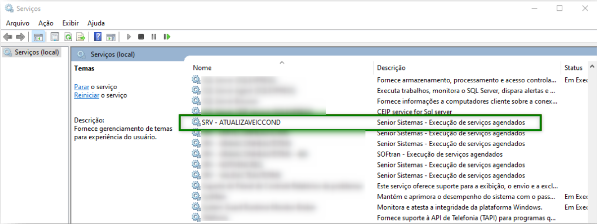 A seguir, para inicializar o serviço, localizar e abrir o aplicativo de Serviços do Windows e encontrar o serviço ATUALIZAVEICCOND na lista, clicando duas vezes sobre o mesmo:
