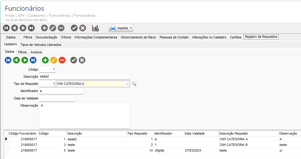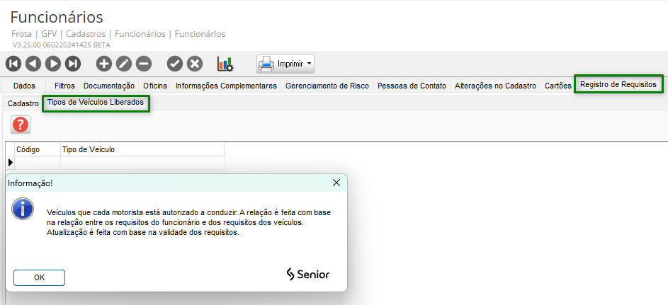 No Cadastro de Funcionários em GFV > Cadastros > Funcionários > Funcionários acessar a guia Registro de Requisitos e clicar na guia Tipos de Veículos Liberados.