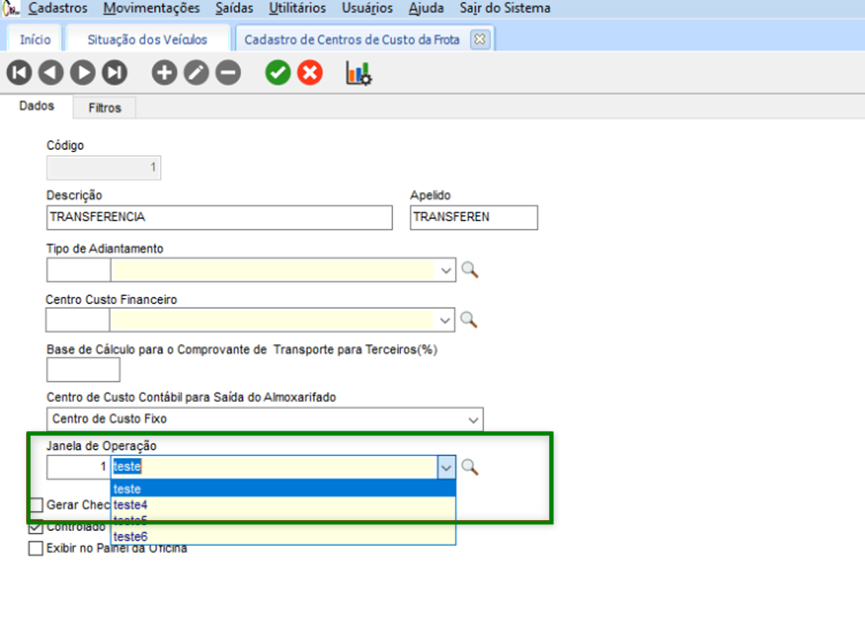 Para isso, na sequência acessar Gestão de Logística > Gestão de Transporte > Gestão da Frota Veicular > Cadastros > Veículos > Centro de Custos da Frota. Para vincular um registro da Janela de Operação de Veículos, ao inserir ou editar um lançamento, selecionar a opção de Janela de Operação, conforme imagem:
