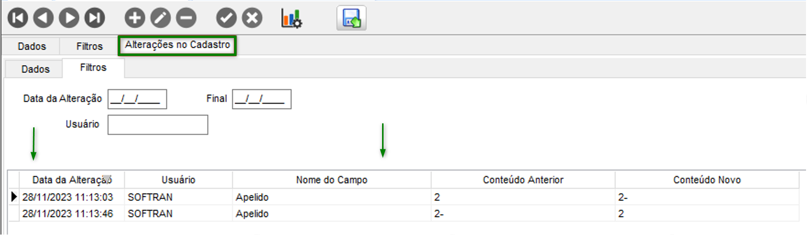 Para pesquisar um registro na guia Filtros, preencha os campos necessários e clique em Filtrar. Em seguida, dê um duplo clique no registro desejado para que os dados sejam carregados na guia Dados.