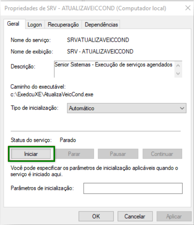 Na janela de propriedades aberta, clicar em Iniciar para dar start no serviço:
