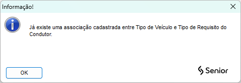 E caso o usuário tente vincular um Tipo do Veículo com um Tipo de Requisito do Condutor que já tenha sido vinculado antes, será exibida a mensagem: