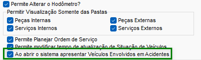 Em CFG > Cadastros > Usuário > Perfil de Usuário, na guia Oficina, habilite a opção Ao abrir o sistema apresentar Veículos Envolvidos em Acidentes para exibir automaticamente os veículos envolvidos em acidentes ao abrir o sistema.