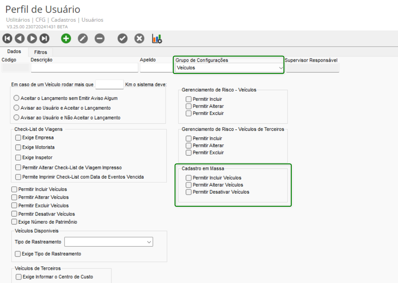 Em CFG, na tela de Cadastro de Perfil de Usuário, grupo de configurações Veículos, será possível definir as permissões de Cadastro em Massa.