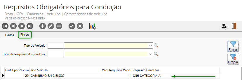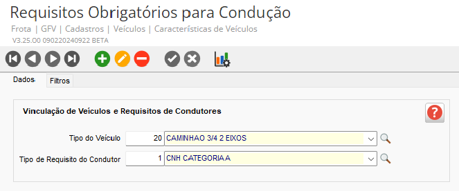Acesse o menu Cadastros > Veículos > Características de Veículos > opção Requisitos Obrigatórios para Condução e na guia Dados, realize o cadastro do Tipo de Veículo e o Tipo de Requisito do Condutor desejado: