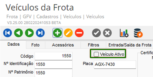 Verifique também, acessando em GFV > Cadastros > Veículos > Veículos > Veículos da Frota, filtrando um veículo que foi bloqueado: