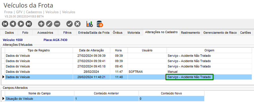 Acessando Cadastros > Veículos > Veículos > Veículos da Frota no GFV, é possivel visualizar as informações sobre as alterações realizadas nos veículos por meio das guias Alterações e Filtros.