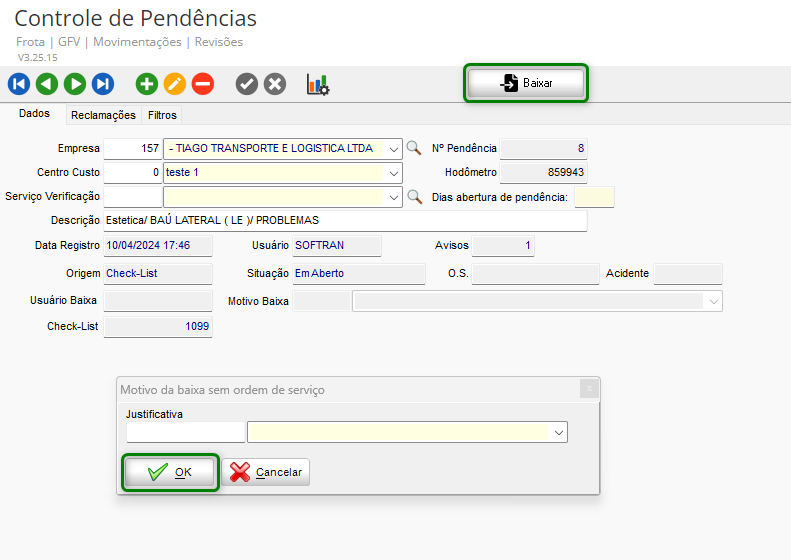 Localizado a pendência, vá na guia dados e clique em Baixar. Preencha a justificativa e clique em ok, a pendência será baixada e o Motivo da baixa esta como concluída.