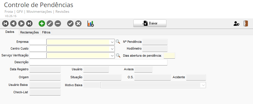 Para isto, navegue até GFV > Movimentações > Revisões > Controle de Pendências, e clique na guia Filtros para buscar a pendência exigida na pré-condição. Clique duas vezes sobre a pendência para que ela seja carregada na guia Dados: