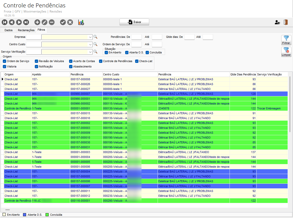 Conforme a origem e situação da pendência, os dados da pendência tem informações diferentes, mas alguns campos são padrões, como por exemplo, empresa, código, centro de custo, descrição, data de registro, usuário, Origem, situação e O.S.