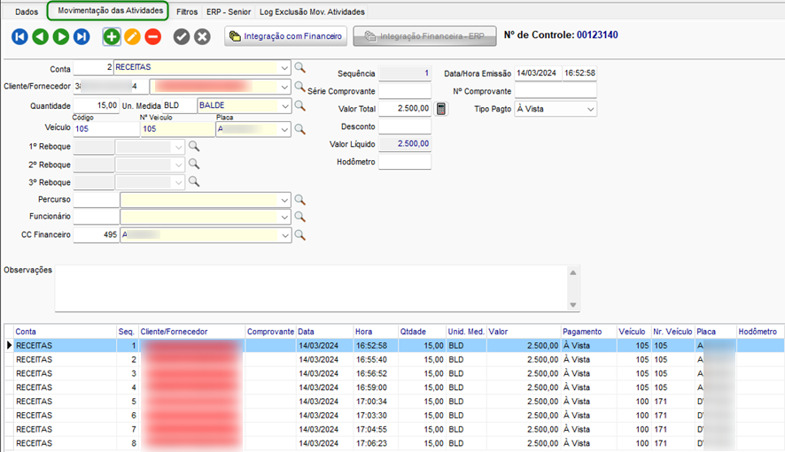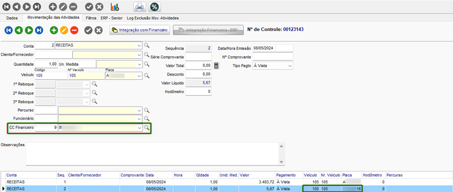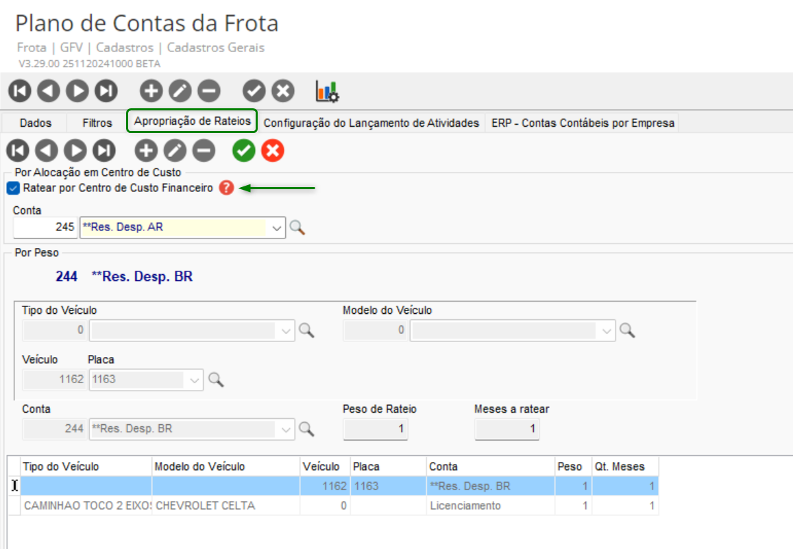 - Acesse a Movimentação das Atividades deste lançamento e verifique o resultado do rateio, deve existir um valor para cada combinação de Veículo x Centro de Custo: