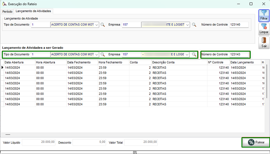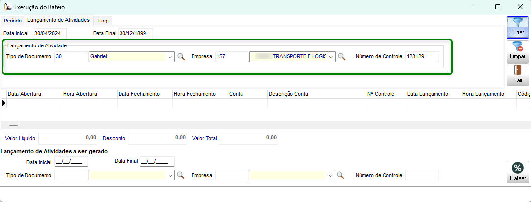 Abrir Rateio para que a tela de Execução do Rateio seja exibida com os campos Tipo de Documento, Empresa e Número de Controle já preenchidos: