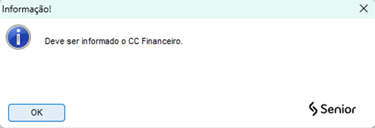 Verifique que o campo CC Financeiro será validado de acordo com a configuração realizada também no plano de contas. Caso a opção definida seja Pedir, será exibida uma mensagem solicitando que informe um centro de custos para salvar o registro.