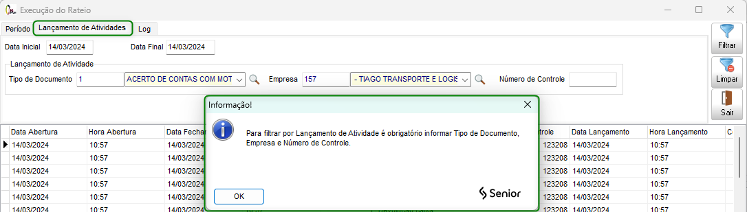 Para utilizar o filtro na guia Lançamento de Atividades, em GFV > Movimentações > Custos > Execução de Rateio, será necessário informar os campos obrigatórios: Tipo de Documento, Empresa e Número de Controle. Quando algum deles não for preenchido, é exibida uma mensagem informando que Para filtrar por Lançamento de Atividade é obrigatório informar Tipo de Documento, Empresa e Número de Controle.