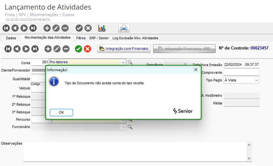 Quando a configuração dos Tipos de Documentos estiver definida para bloquear lançamentos em contas distintas, ao acessar a guia de Movimentação das Atividades e clicar em Novo Registro para adicionar uma nova movimentação, caso seja selecionada uma conta não permitida pelo Tipo de documento, será exibida uma mensagem de validação, conforme a imagem a seguir: