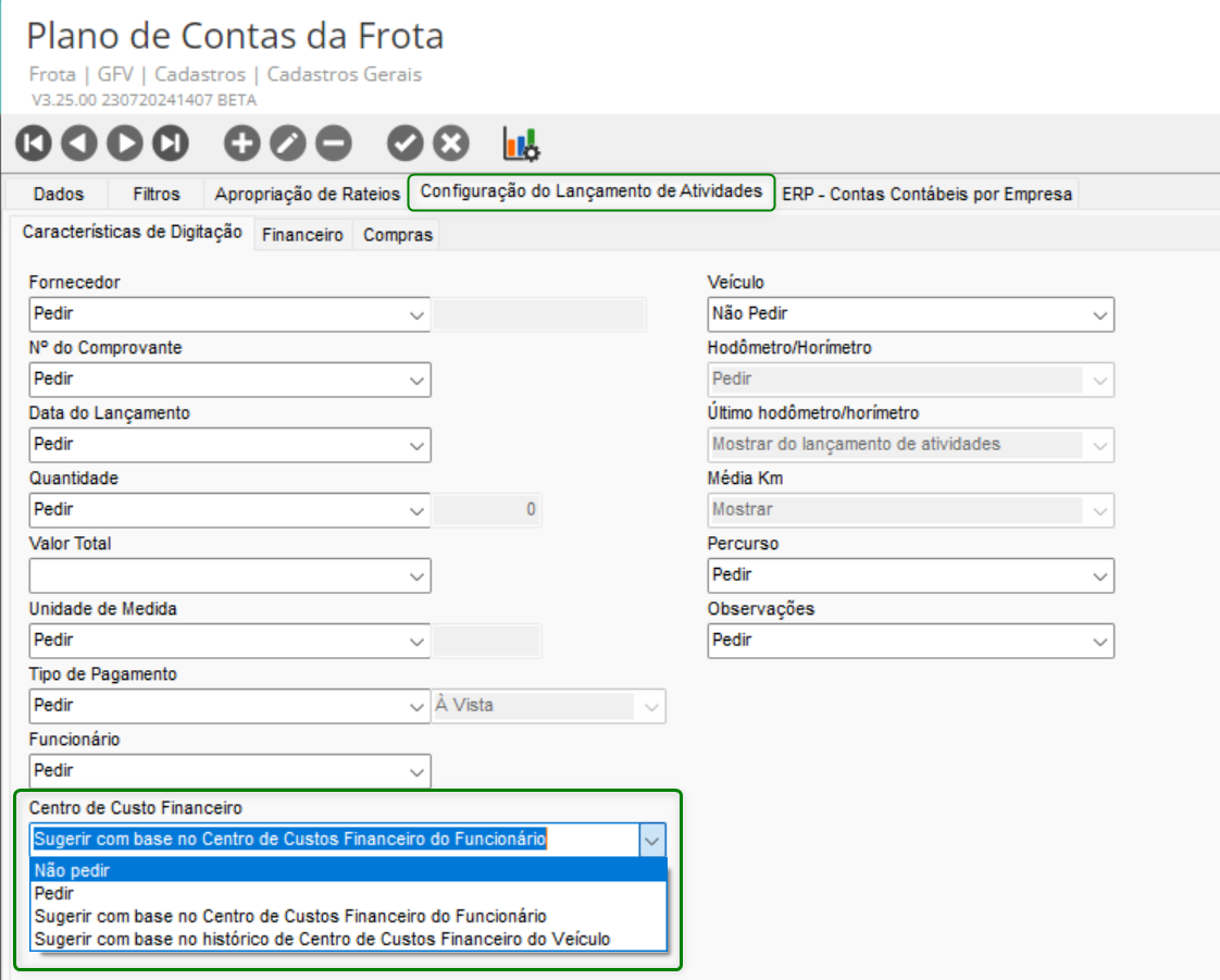 Na rotina GFV > Cadastros > Cadastros Gerais > Plano de Contas da Frota > Configuração do Lançamento de Atividades, selecione uma conta e defina qual regra será aplicada para o campo CC Financeiro presente na tela de Lançamento de Atividades: