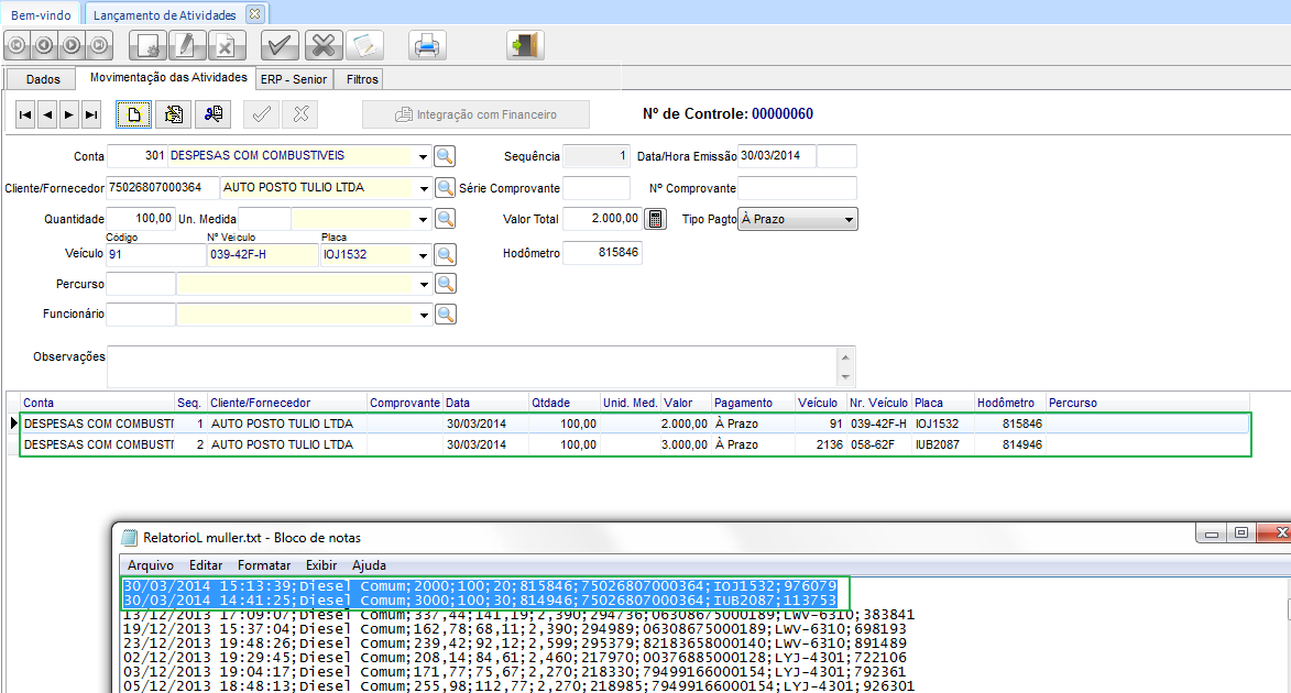 Na tela de Lançamento de Atividades, em GFV > Movimentações > Custos >Lançamento de Atividades, os registros são gravados de acordo com as informações do arquivo importado.