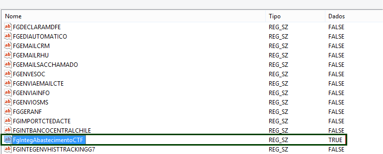 Após a configuração do serviço RBT, a opção FgIntegAbastecimentoCTF deve estar marcada como TRUE no REGEDIT: