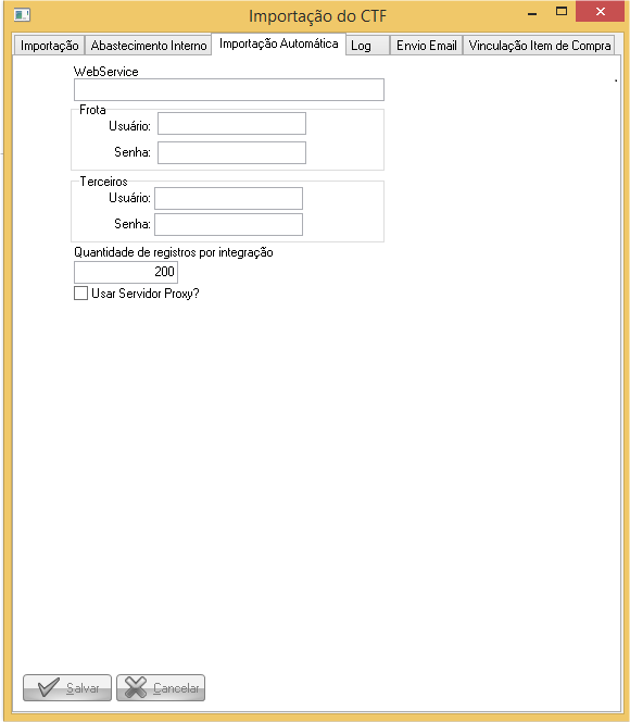 Em GFV > Utilitários > Importação > Custo da Frota > Importação do CTF, na guia Importação Automática deverá ser informado os dados para a conexão com o webservice: endereço do Webservice, usuário e senha que são disponibilizados pela CTF. No campo Quantidade de registros por integração é possível definir a quantidade de registro que será integrado.