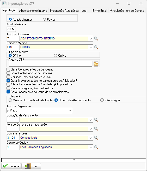 A importação é realizada automaticamente através do módulo RBT que fica constantemente consultando o webservice do portal CTF verificando se há novos registros para importação. Caso houver, a importação dos abastecimentos é realizada conforme os dados informados na guia Importação em GFV > Utilitários > Custo da Frota > Importação do CTF