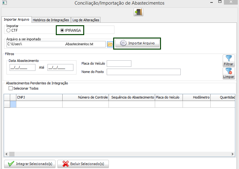 No módulo GFV em Utilitários > Importação > Custos da Frota > Conciliação/Importação de Abastecimentos, na guia Importar Arquivo marcar a opção IPIRANGA.
