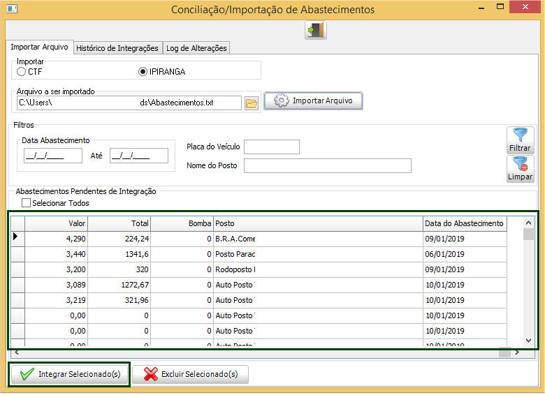 Selecione os abastecimentos que deseja integrar e clicar no botão Integrar Selecionado(s).