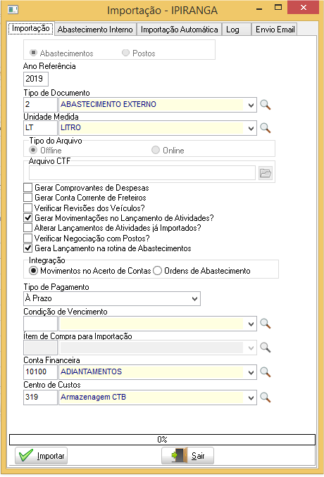 O objetivo da solução é importar de um arquivo txt os abastecimentos externos dos motoristas nos postos Ipiranga, conforme o leiaute do sistema Pró-Frotas Ipiranga e atualizar as informações na rotina de lançamento de atividades.