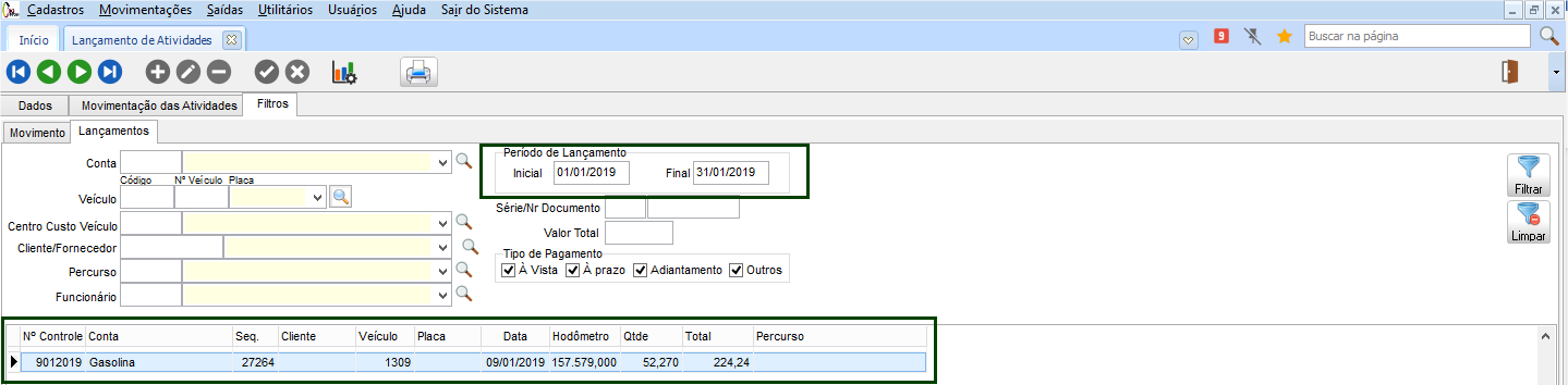 Após a importação dos abastecimentos dos Postos Ipiranga, é possível verificar o lançamento de atividades desses abastecimentos importados. Acesse GFV > Movimentações > Custos > Lançamento de Atividade e localize os lançamentos pela data do abastecimento, é possível listar a atividade relacionada ao abastecimento importado.