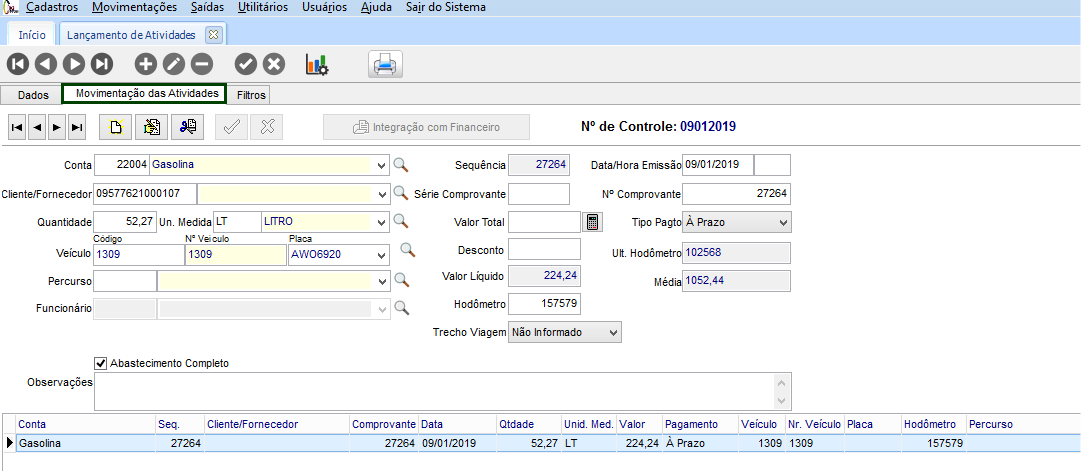 Informe todos os dados e clique em Importar, a importação dos abastecimentos estará 100% concluída e será possível consultar no lançamento de atividades esses abastecimentos importados.