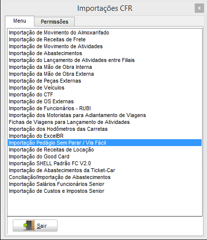 No módulo GFV – Gestão de Frota, em Utilitários > Importação > Custo da Frota > Importação Pedágio Sem Parar/Via Fácil, a importação é realizada de um arquivo XLS do Excel Conforme Leiaute.
