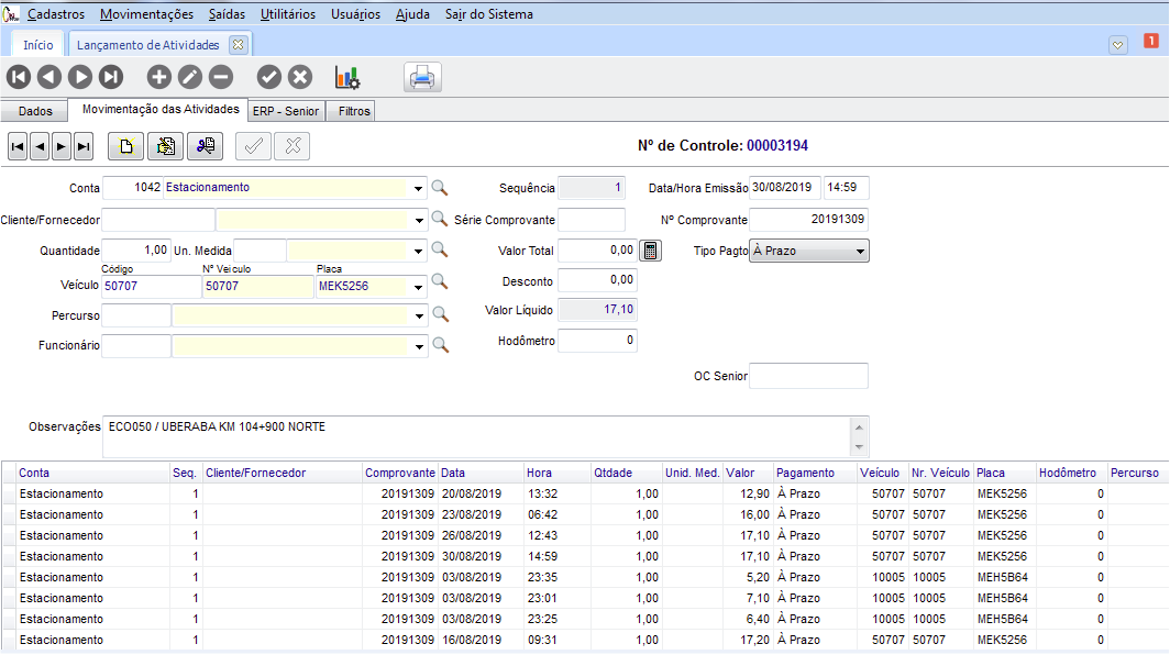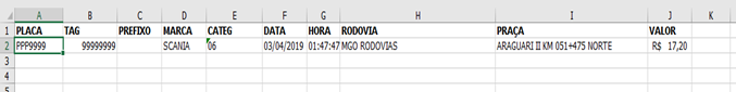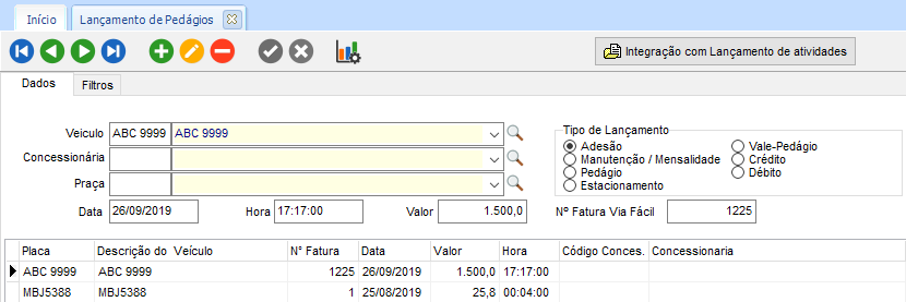 - Pedágio: importando somente as passagens do veículo pelo pedágio.