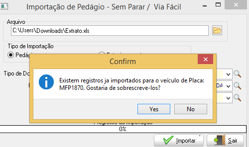 Caso o arquivo já tenha sido importado, ao tentar importar novamente, será apresentado a mensagem que já existem registros importados para veículos da planilha e caso deseja sobrescreve-lo basta confirmar na mensagem apresentada.