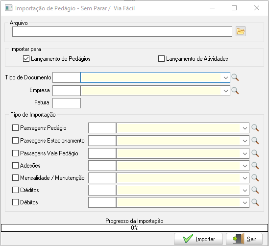 A importação será feita para o Lançamento de Pedágios, com a possibilidade de também importar para o Lançamento de Atividades. Para realizar a importação é obrigatório informar os campos Tipo de documento, Empresa, Conta e o Número da fatura.