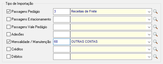 É possível importar passagens de pedágio, estacionamento, vale pedágio, adesões, mensalidades/manutenções, créditos e débitos, cada um podendo tem um Plano de Conta de Custo diferente.