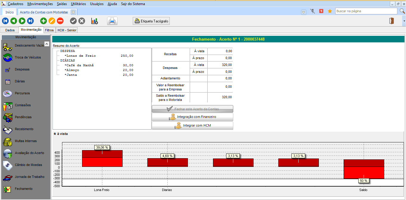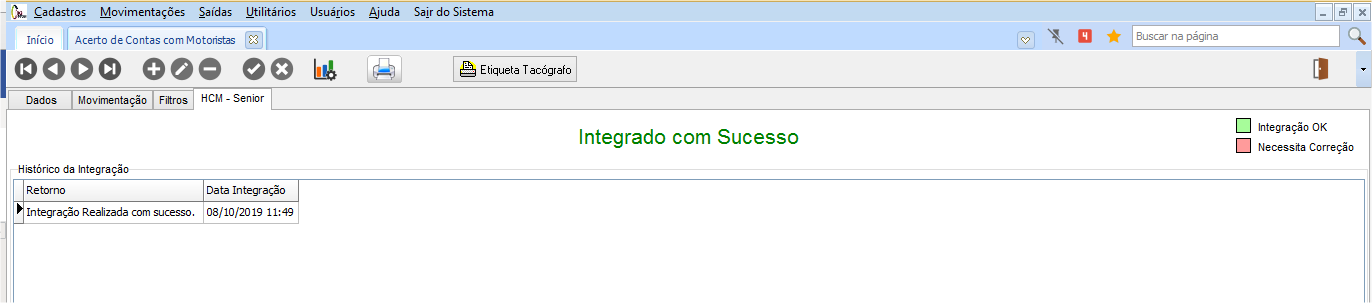 Após realizar o fechamento do acerto de contas, no botão Integração com HCMpoderá integrar os lançamentos do acerto de contas de motorista com a rotina de Vales do Senior HCM.