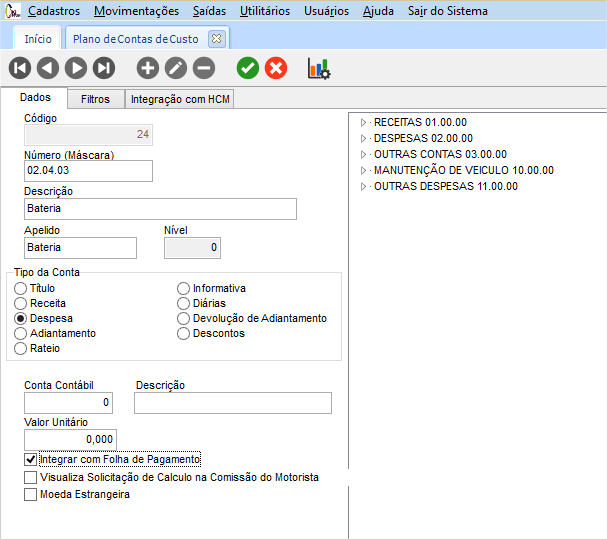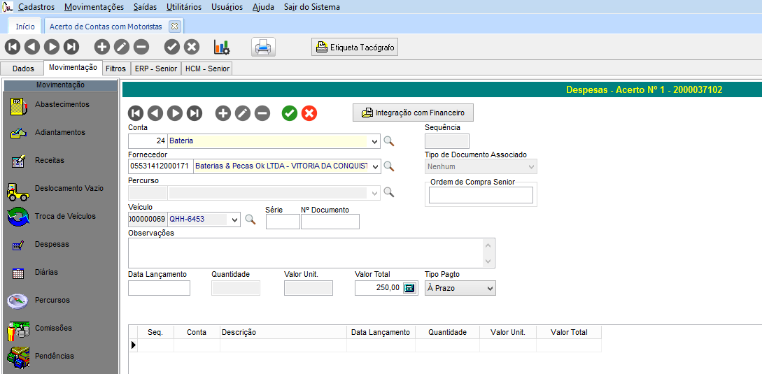 - Número do vale do Senior HCM deve estar configurado no Cadastro do Plano de Contas da Frota.