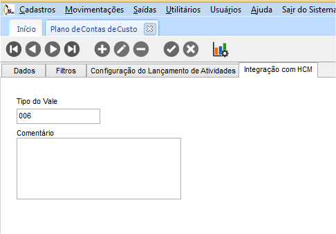 Após configurar a conta para integrar com a folha de pagamento, será necessário configurar o número do Vale no cadastro do plano de contas, na guia Integração com HCM deverá ser informado o código do Vale para a integração com a rotina de Vales do Senior HCM.