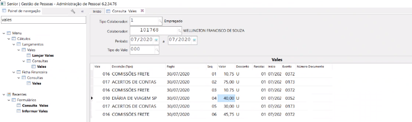 No Gestão de Pessoas | HCM, na rotina de Vales é possível verificar o valor do lançamento integrado do acerto de contas de motorista.