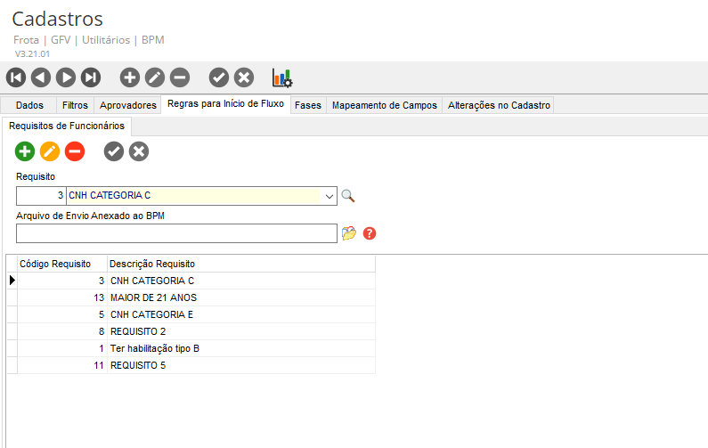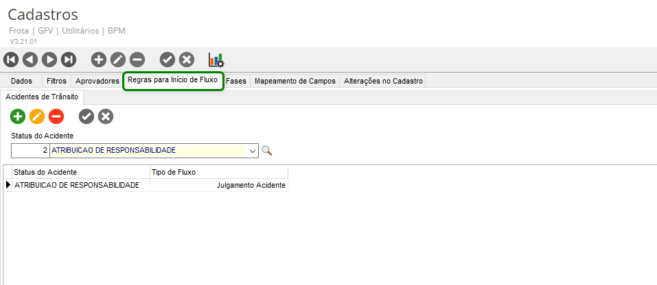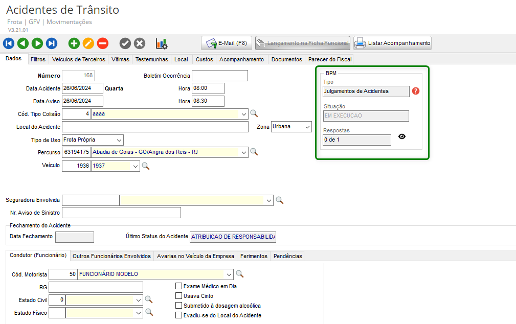 O GFV possui dois tipos de fluxos BPM configurados, que podem ser inicializados através das telas de Acidentes de Trânsito e Requisitos de Funcionários:
