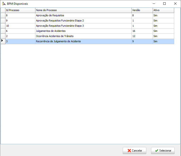 A tela com os todos os BPMs disponíveis será exibida e o usuário deverá selecionar um BPM para o cadastro. As informações serão importadas para dentro do cadastro (dados do BPM e os campos do formulário da plataforma).