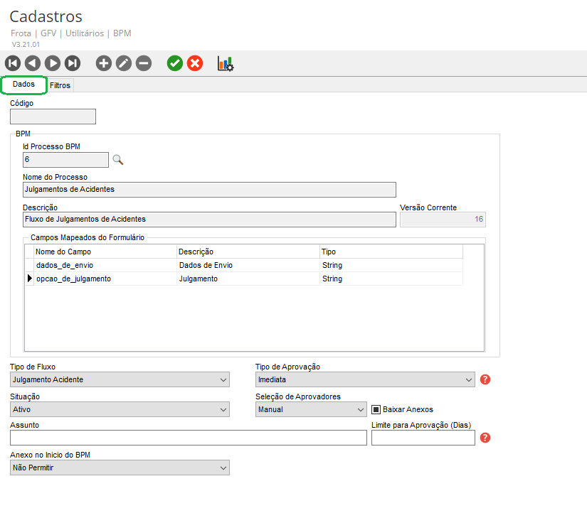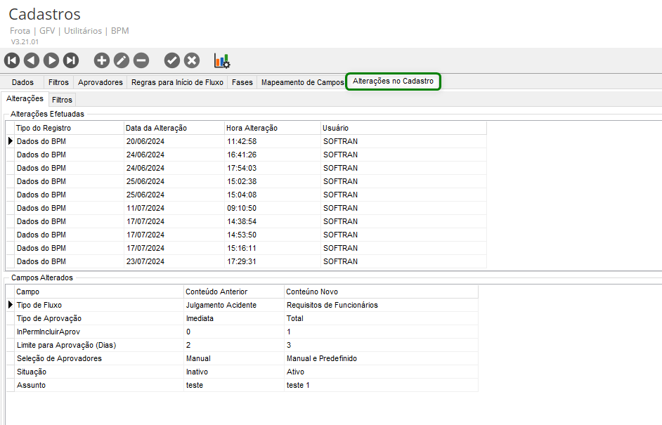 Nesta guia são armazenados todos os dados alterados da tabela principal do BPM (SISBPM).
