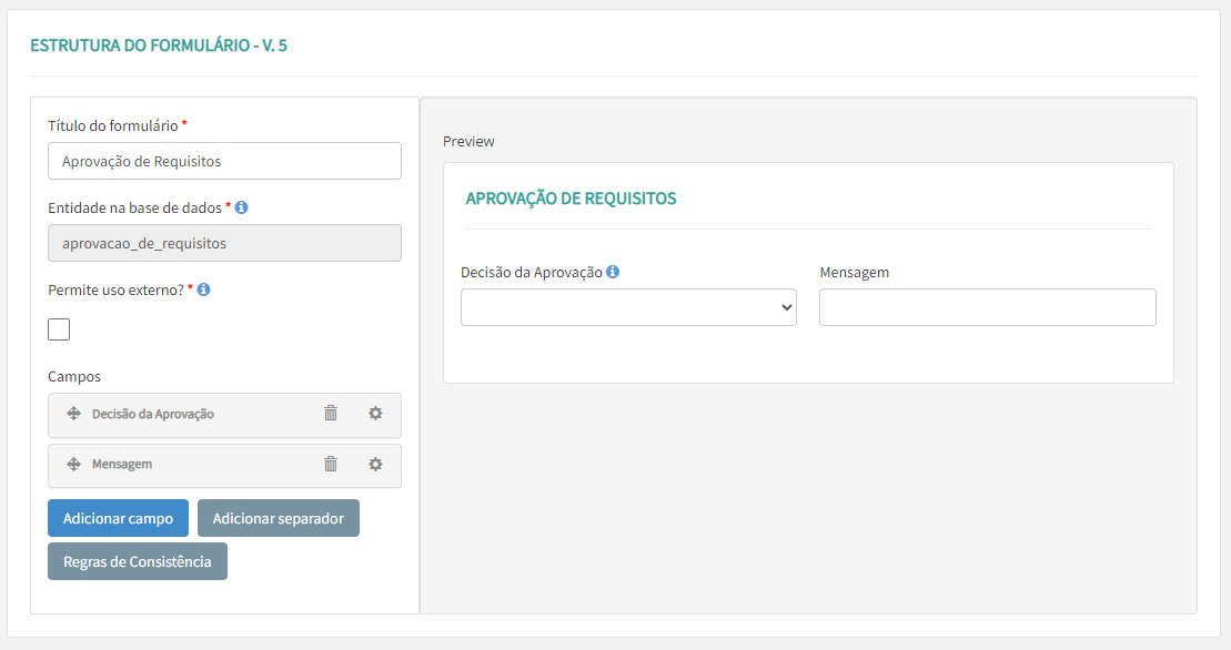 O usuário pode criar qualquer tipo de campo para o formulário exibido no BPM dentro da Plataforma Senior X. No entanto, é obrigatório que o formulário tenha pelo menos um campo, responsável por alterar a fase.