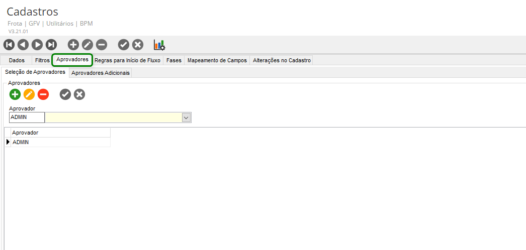 Já na guia Aprovadores Adicionais, caso exista uma função pré-definida no sistema para o tipo de fluxo de BPM envolvido, será permitida adicionar funções que podem participar como aprovadores adicionais, caso existam usuários cadastrados. O sistema irá envolver estes usuários no processo de aprovação, como exemplo Motorista.